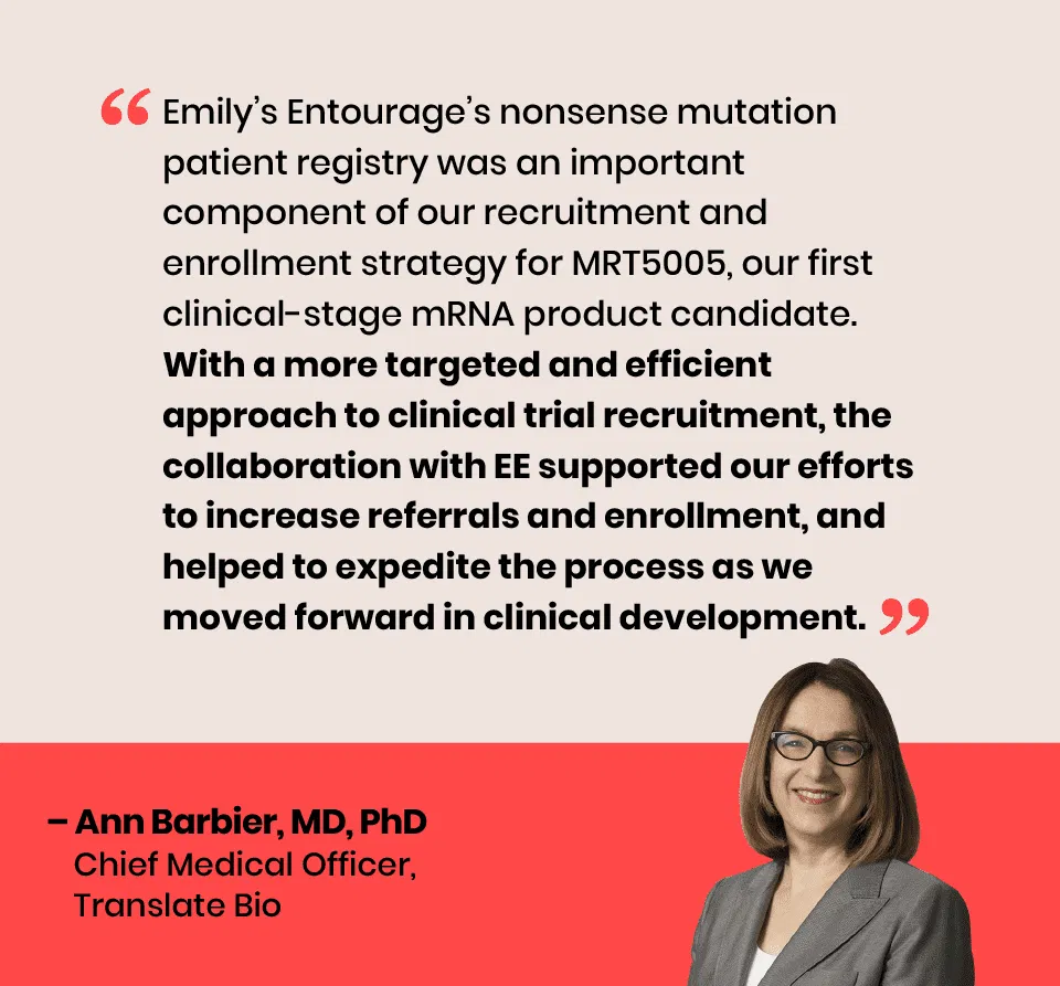 För att påskynda rekryteringen till kliniska prövningar skapade Emily's Entourage (EE) CF Clinical Trial Connect: en global patientdatabas exklusivt för personer med CF som inte kan dra nytta av CFTR-modulatorer, inklusive personer med olämpliga genetiska mutationer, biverkningar eller suboptimal respons på CFTR-modulatorer. CTC-databasen gör det möjligt för dessa personer att bidra med sina data och få information om relevant klinisk forskning och prövningar. Med hjälp av data från CTC kopplar Clinical Trial Matchmaking Program sedan samman personer med CF med relevanta möjligheter till kliniska prövningar för att påskynda rekryteringen till kliniska prövningar genom riktad uppsökande verksamhet från en betrodd källa.
